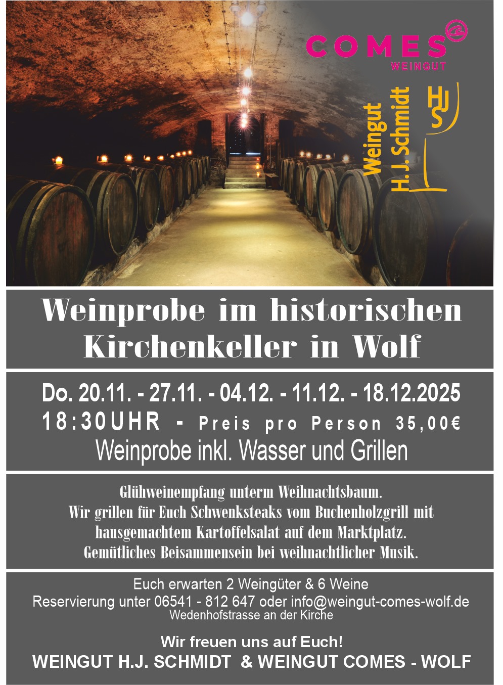 - Donnerstags Weinprobe in der historischen Kirche mit Steaks vom Schwenkgrill (weitere Informationen finden Sie im Flyer)