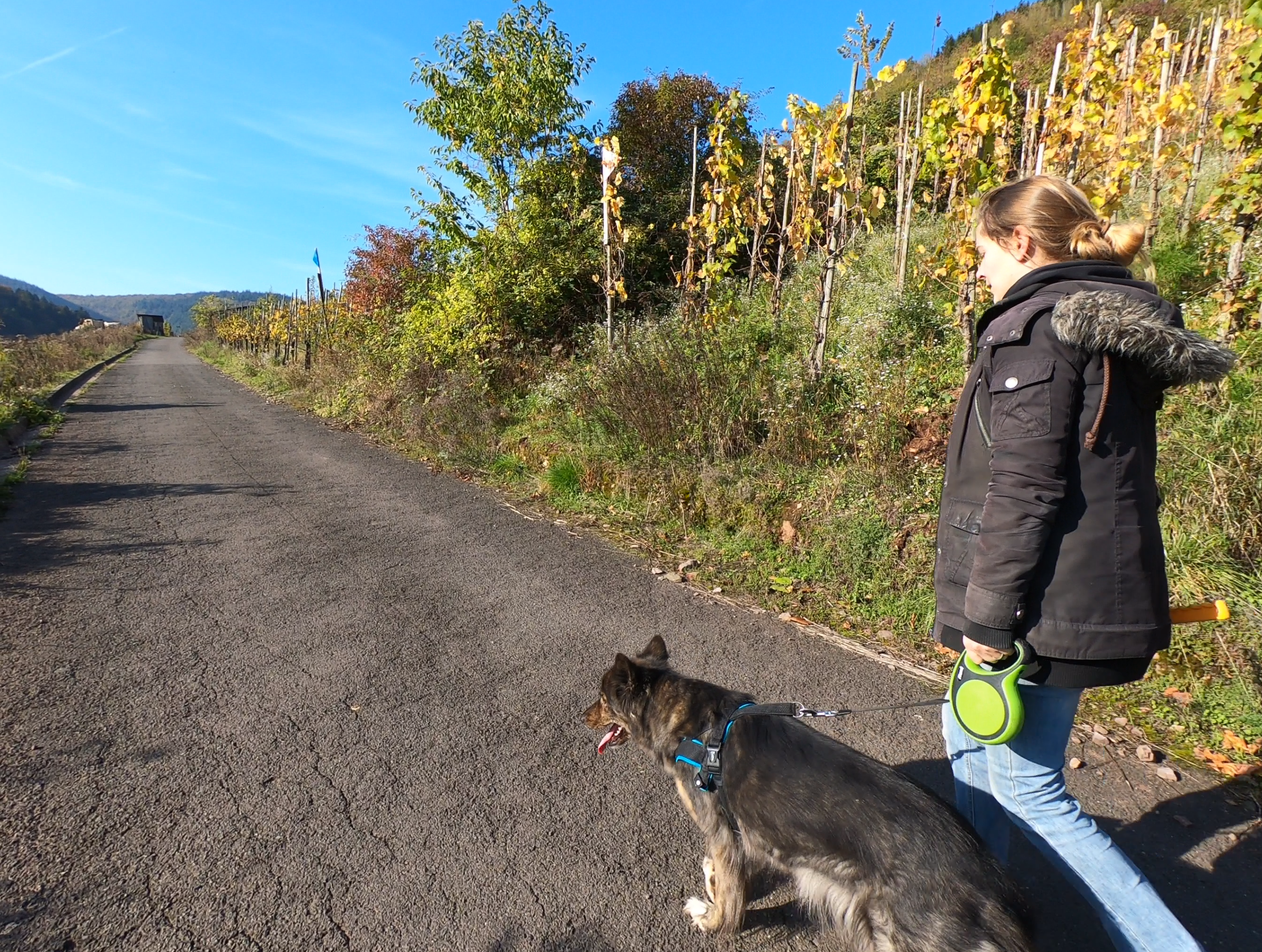 Wir starten entlang des Alfbachs und steigen durch den Wald in Richtung Weinberge auf. Oben angekommen, erwartet uns ein herrlicher Blick über das Moseltal – ein Moment zum Innehalten und Genießen. Anschließend wandern wir gemütlich zurück Richtung Dorf und Campingplatz. Unterwegs machen wir kleine, spielerische Übungen, die Ruhe, Körperbewusstsein und Impulskontrolle fördern. So wird der Spaziergang nicht nur schön, sondern auch bereichernd für Sie und Ihren Hund.