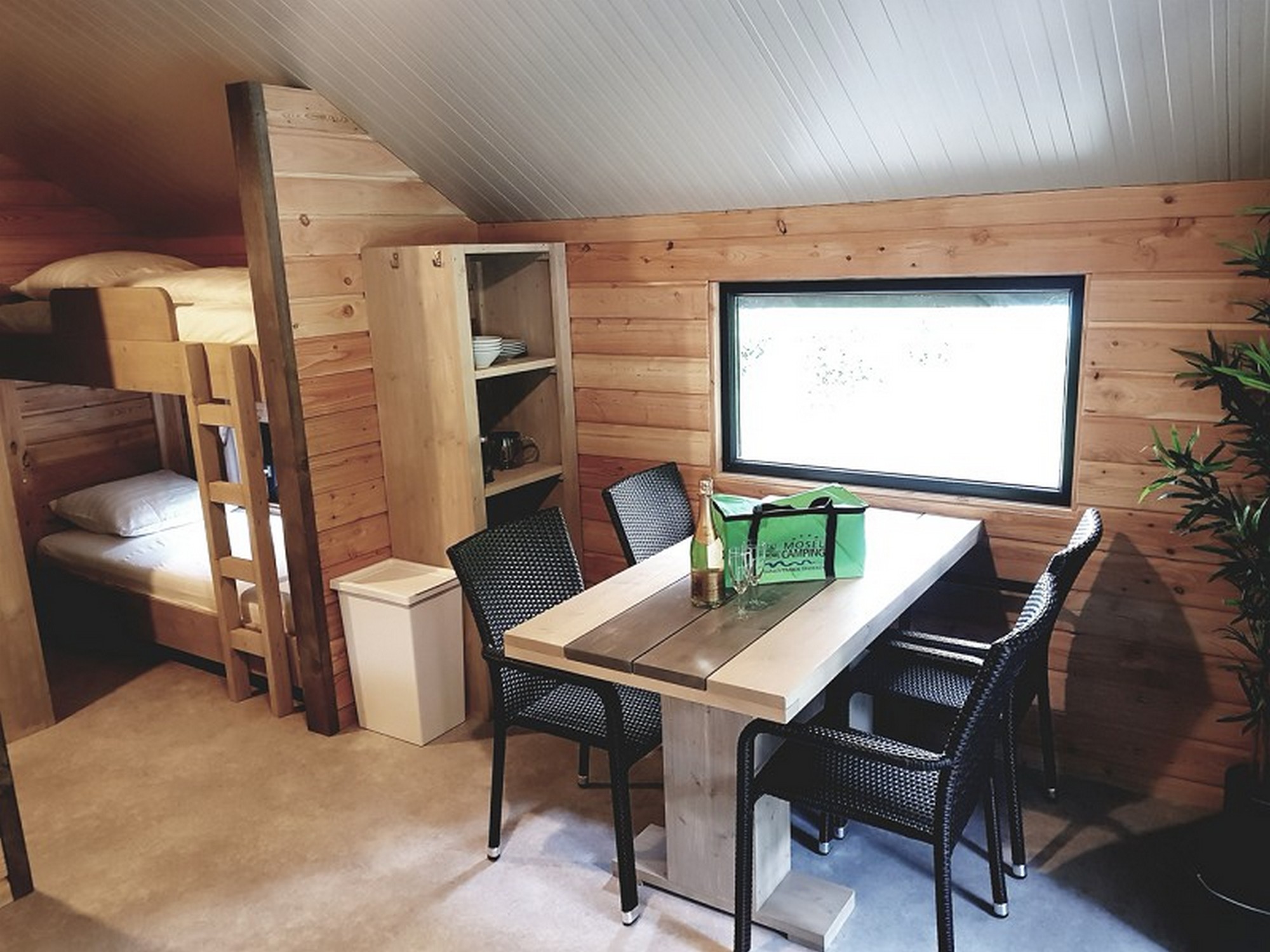 Romantisch chalet uit hout met een geisoleerd dak dat met tentdoek overtrokken is. Het chalet is lekker knus, volledig ingericht en geschikt voor 2 tot 4 personen.