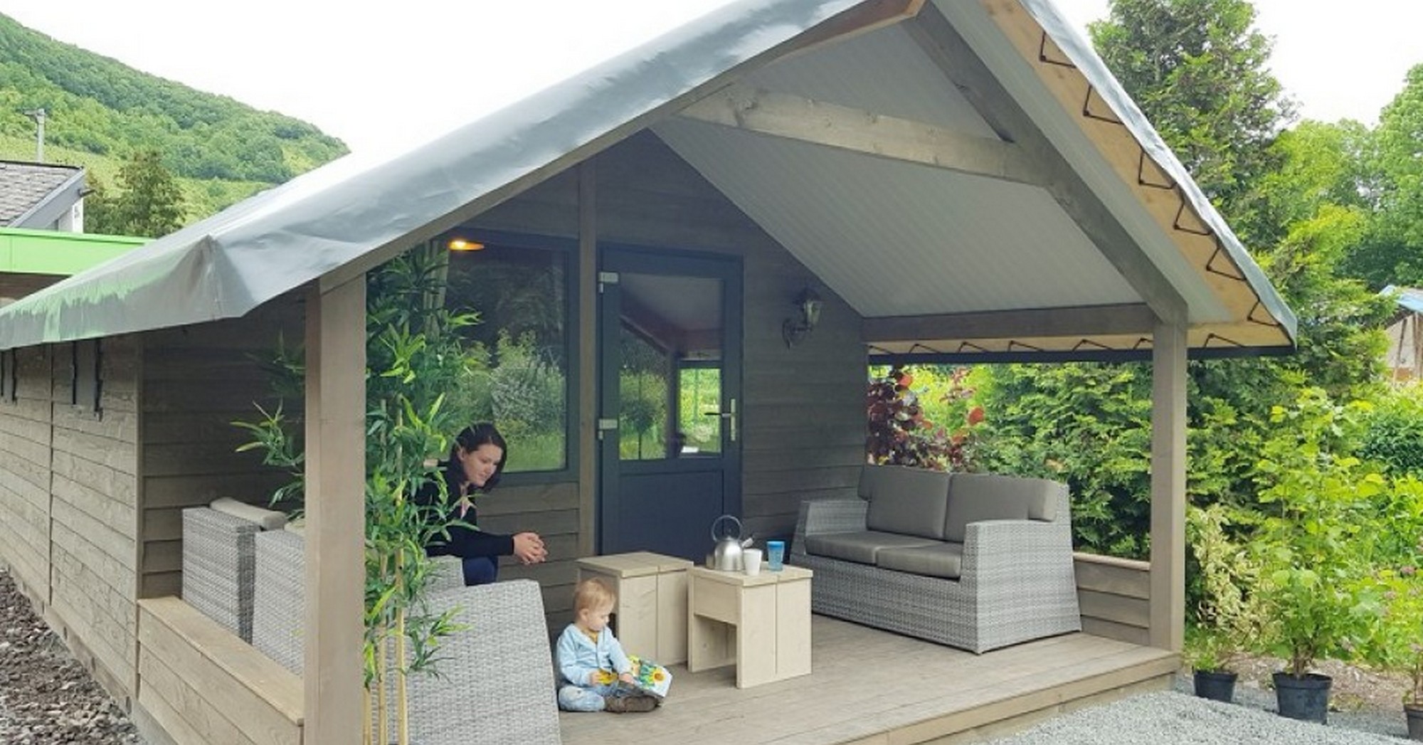 Veel vrij uitzicht met ligging op een hoekplaats en onderaan het kampeerveld ligt de forellenbeek met strand aan de beek. Het cosy chalet biedt een ingerichte keuken, 2 slaapkamers, woonkamer en toilet. De douches kunnen van de camping gebruikt worden en vind u direct achter het cosy chalet.